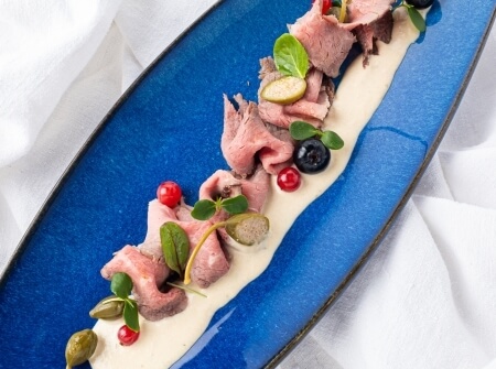 Roast beef of veal with tuna sauce and citrus fruits and caper berries