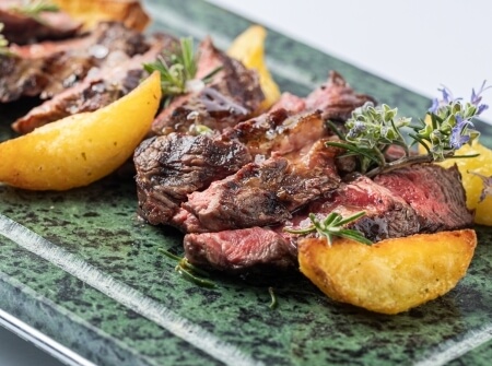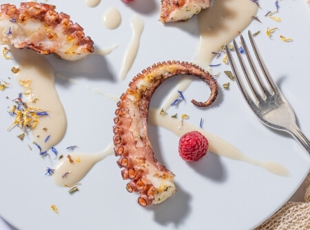 Smoked red tuna carpaccio, guacamole sauce, wild herbs and balsamic reduction