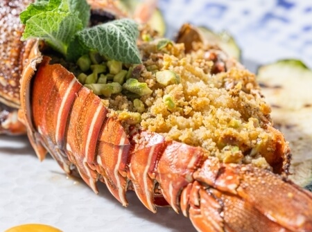 Lobster in a crust of aromatic bread and dried fruit with grilled courgettes and turmeric mayonnaise