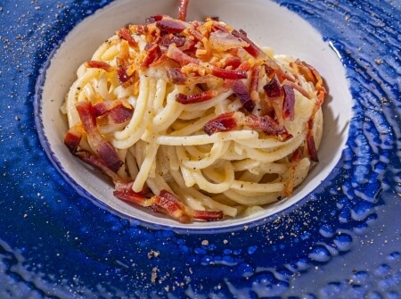 Spaghettone creamed in the shape of grana with crispy jowl bacon and black pepper